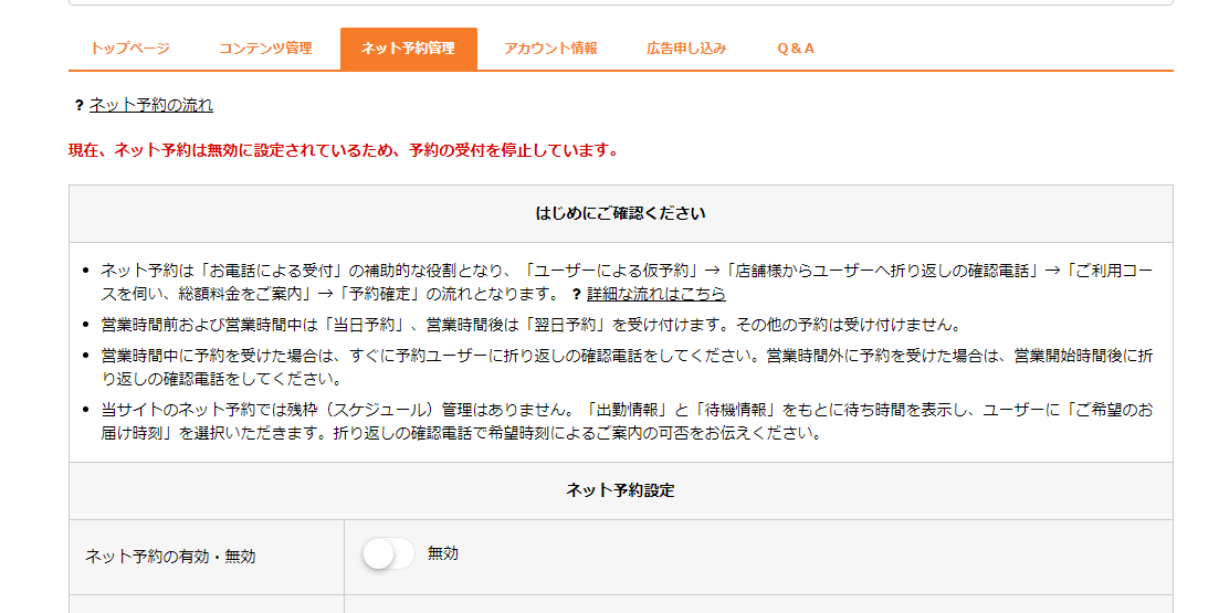 ネット予約は「お電話による受付」の補助的な役割としてご利用いただくことが可能となりますが。初期状態ではネット予約機能は無効となっているため、管理画面の「ネット予約管理」にて、機能を有効すると店舗ページに「ネット予約ボタン」が表示されるよう になります。