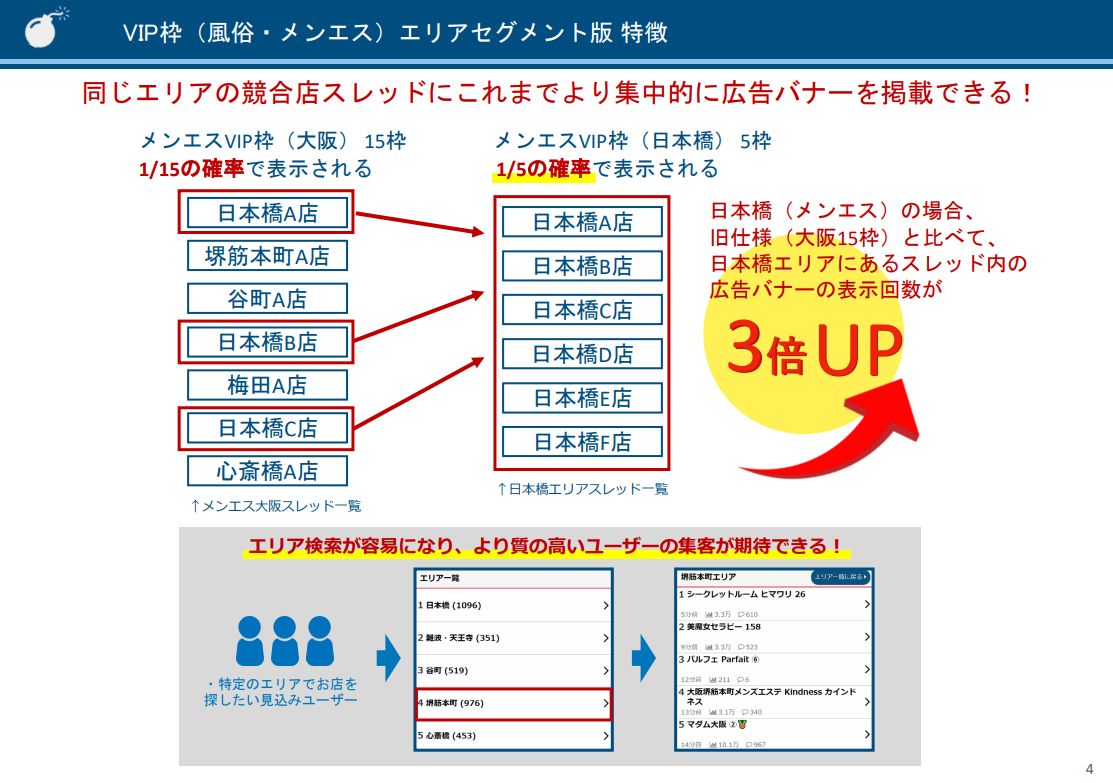 2023年9月掲載より、「東京・愛知・大阪」エリアのメンエスVIP枠に関して、エリアセグメント版への変更となります。同じエリアの競合店スレッドにこれまでより集中的に広告バナーを掲載できるようになり、訴求効果がより実感しやすい変更となりますので、是非この機会に掲載をオススメいたします!