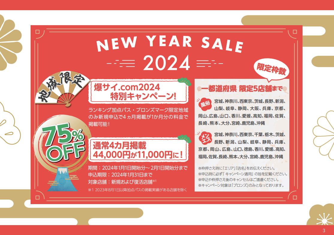 大好評のランキング加点パスにおきまして、地域限定の特別キャンペーンを開催いたします。ブロンズマークが★75%OFF★1ヶ月の料金で初回4ヶ月掲載が可能です。一都道府県限定5店舗様となりますので、お早めにお申し込みください。
