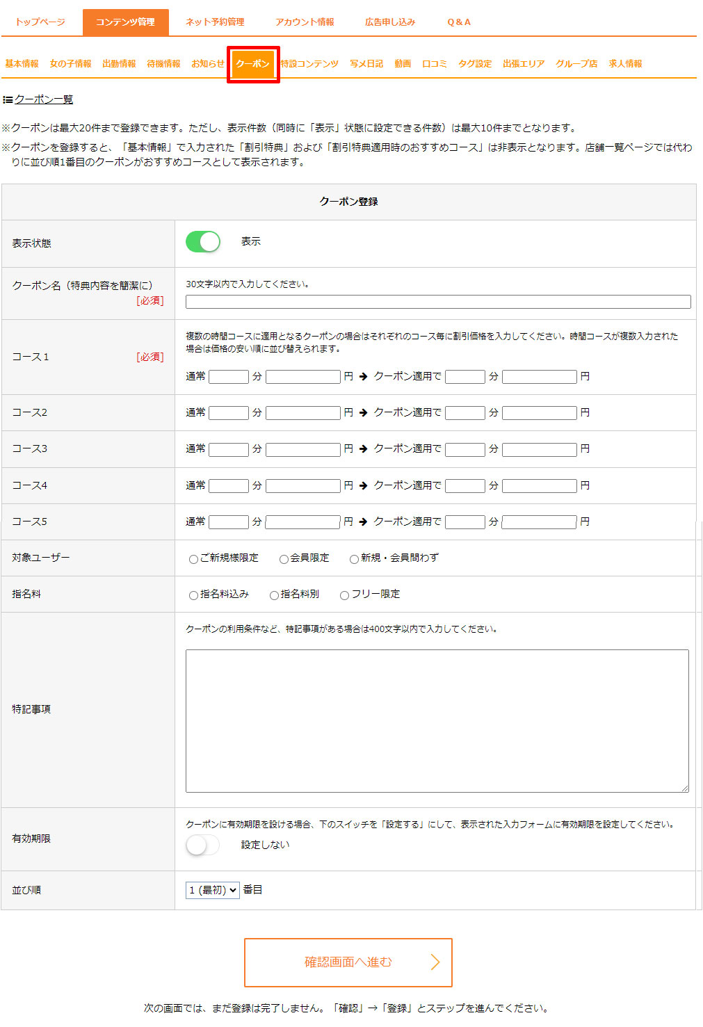クーポンを登録すると、「基本情報」で入力された「割引特典」および「割引特典適用時のおすすめコース」は非表示となります。