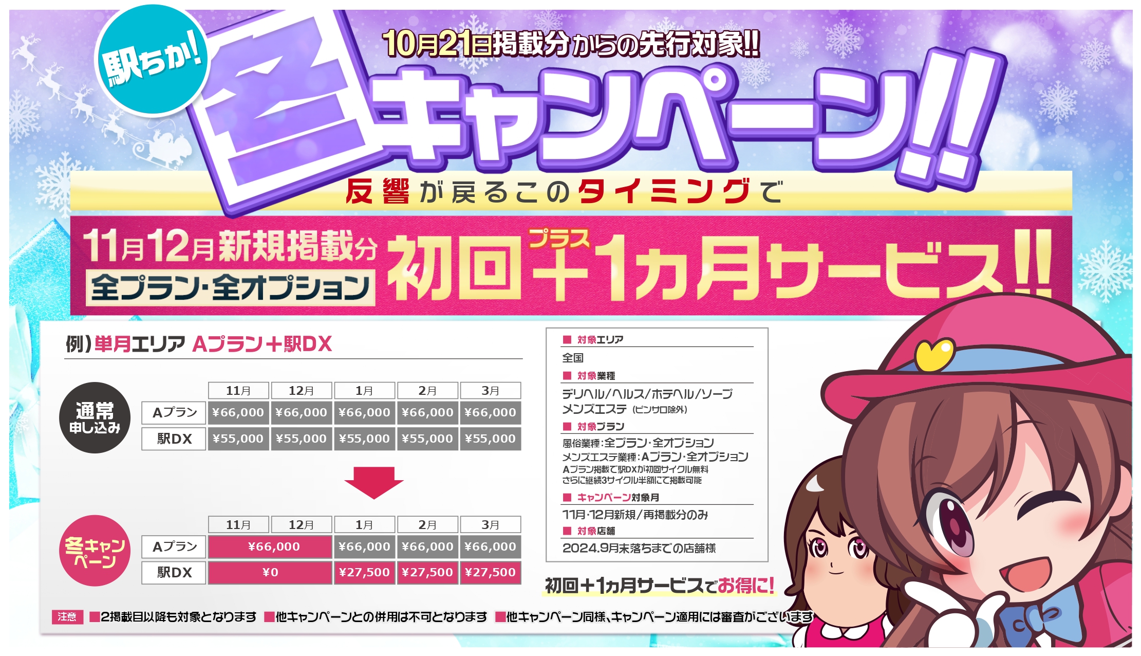2024年11月・12月新規掲載分の基本掲載・各オプションが【初回+1ヶ月】で掲載が可能となります!