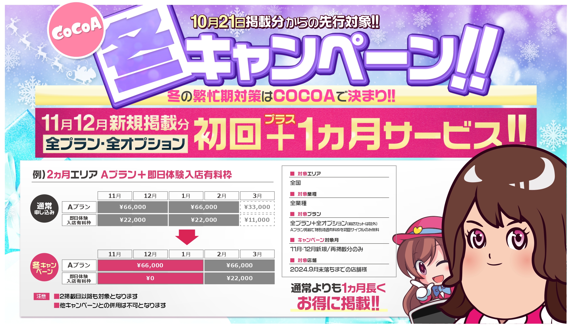 2024年11月・12月新規掲載分の全プラン・各オプションが【初回+1ヶ月】で掲載が可能となります!