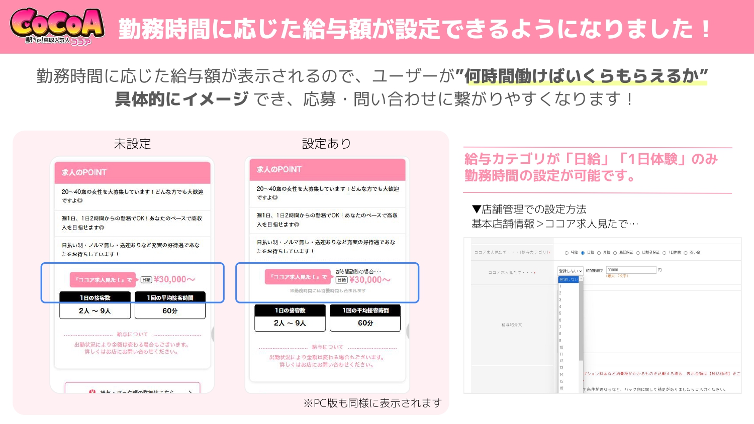 給与設定<ココア求人なら¥〇〇~>で、「日給」または「1日体験(体験入店)」を選択した場合に、勤務時間の設定を追加されました。