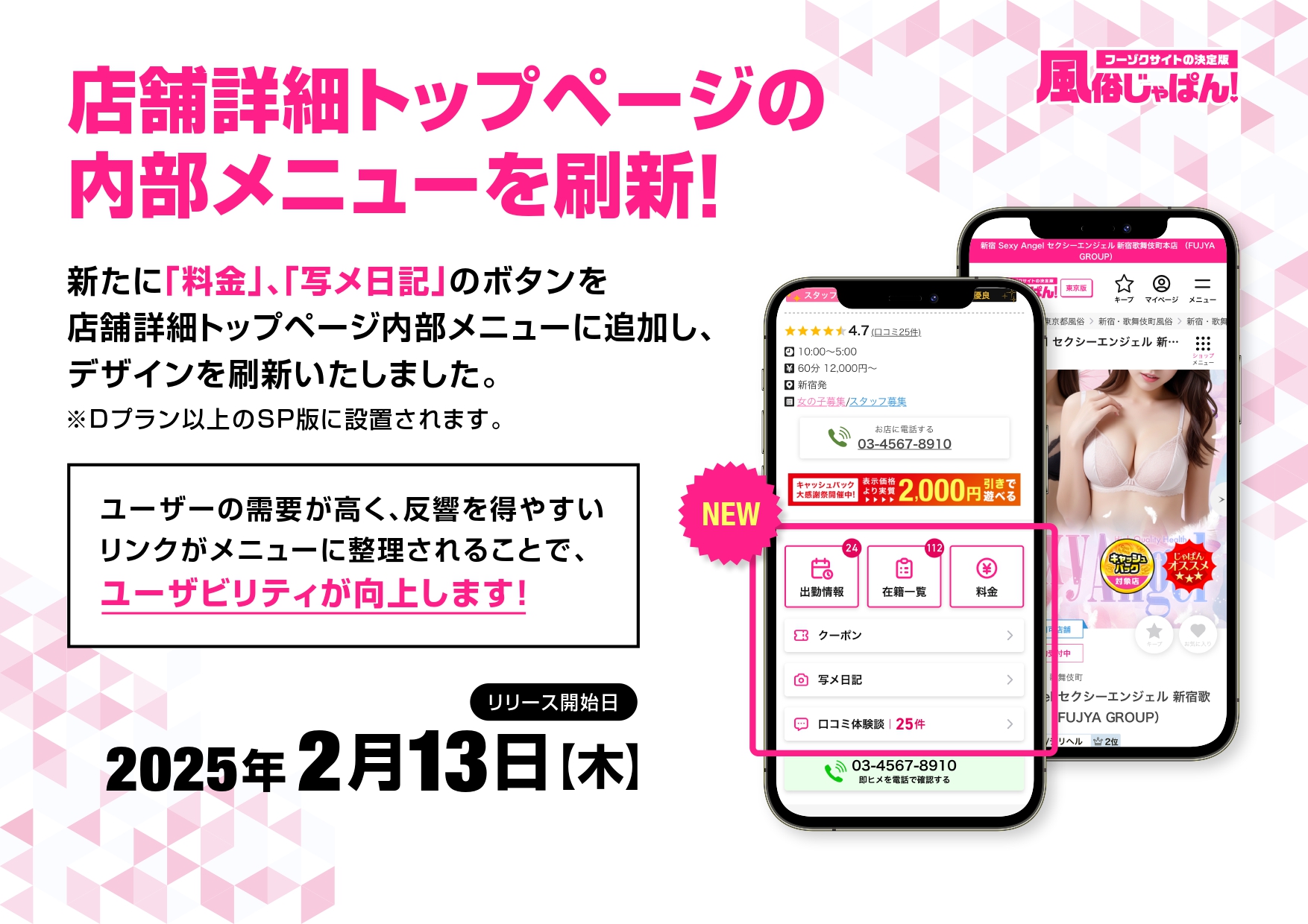 風俗じゃぱんより、店舗詳細トップページの内部メニュー改修のお知らせです。