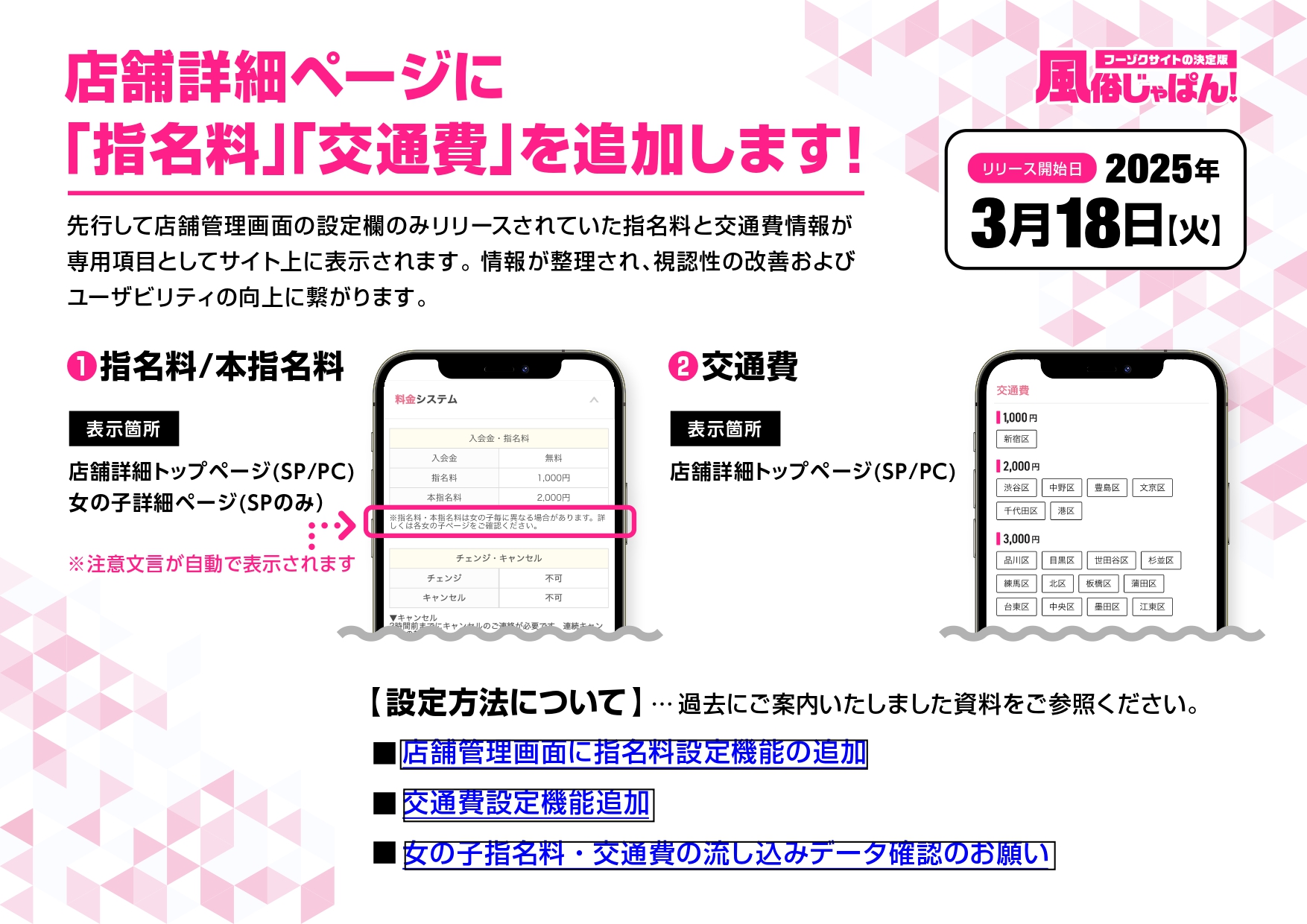 風俗じゃぱんより、「指名料」と「交通費情報」設定項目の、ユーザーページ側への表示実施のお知らせです。