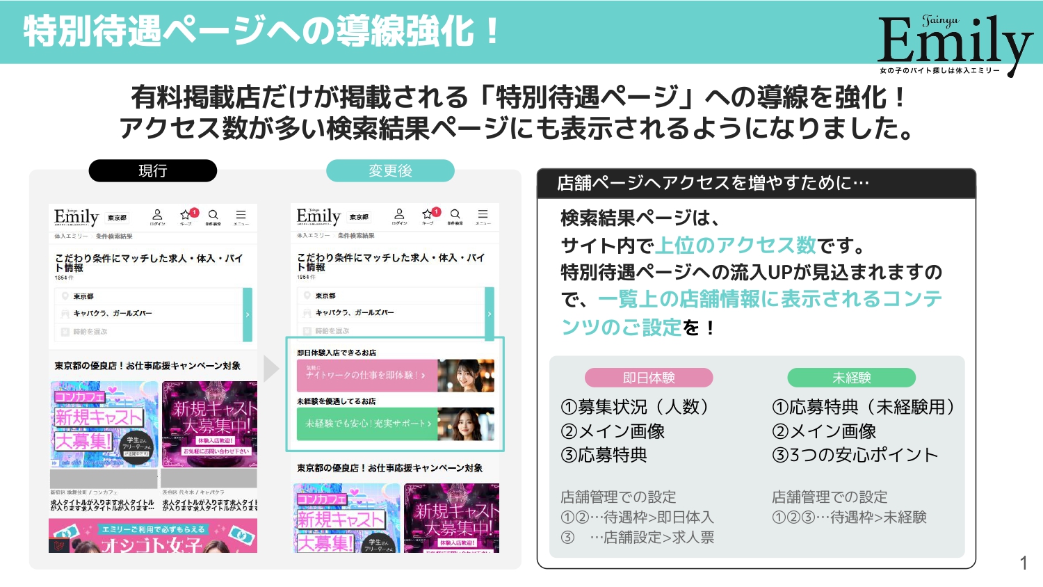 【体入エミリー】特別待遇ページへの導線強化のお知らせ