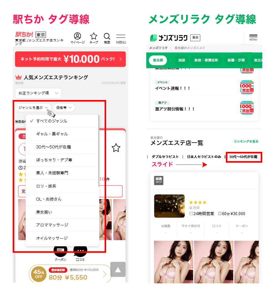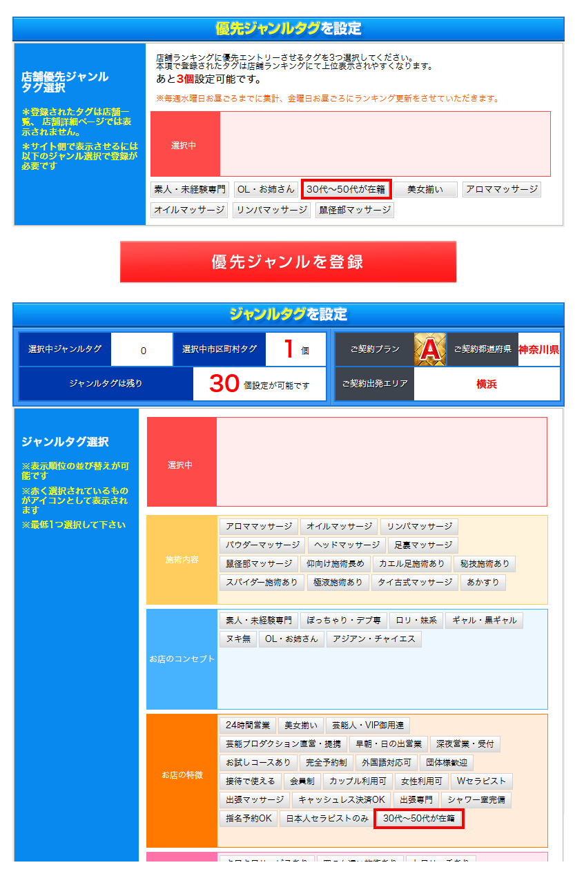 SEO対策の一環として、メンズエステ業種において「人妻・熟女」タグが削除されていましたが、この度代替タグとして、「30代~50代が在籍」が追加されます。