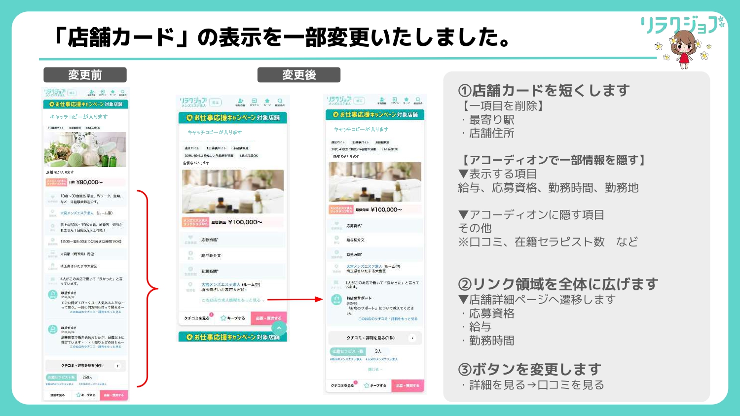 リラクジョブより、店舗一覧ページの「店舗カード」の表示一部変更のお知らせです。