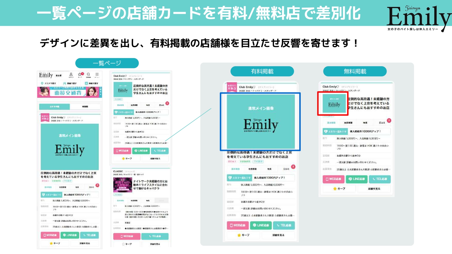 体入エミリーより、一覧ページの店舗カードを有料/無料店で差別化のお知らせです。