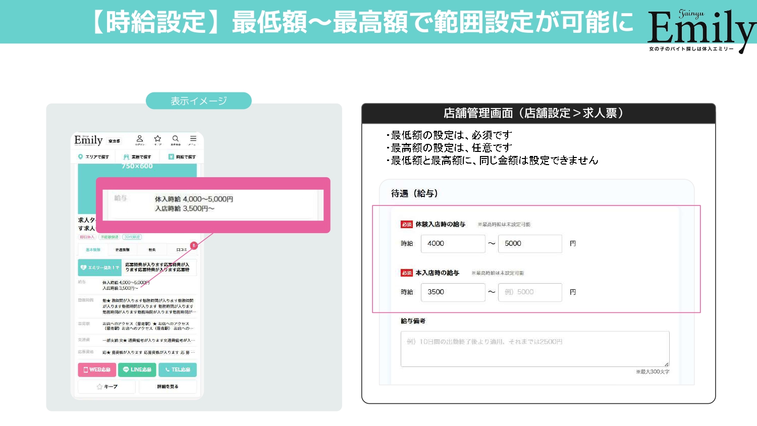 【体入エミリー】時給設定「最低~最高」の範囲設定可能のお知らせ
