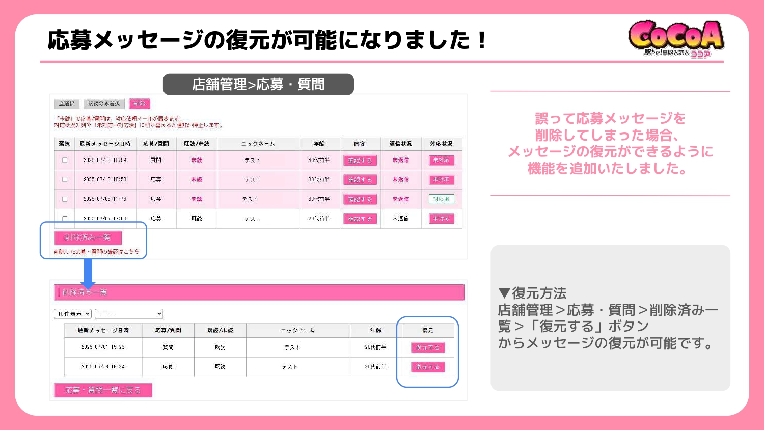 ・店舗管理>応募・質問>削除済み一覧>「復元」ボタン