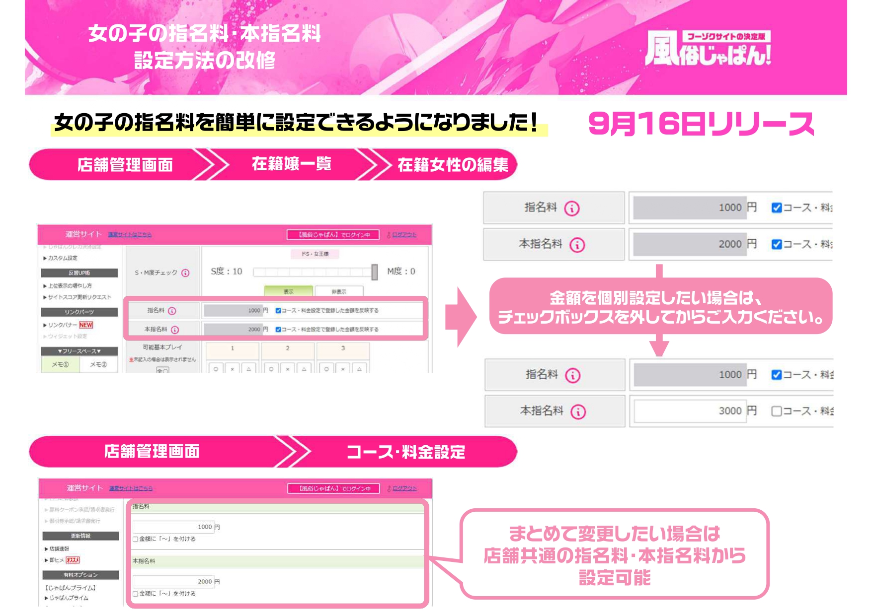 風俗じゃぱんより、女の子指名料・本指名料に関する改修のお知らせです。