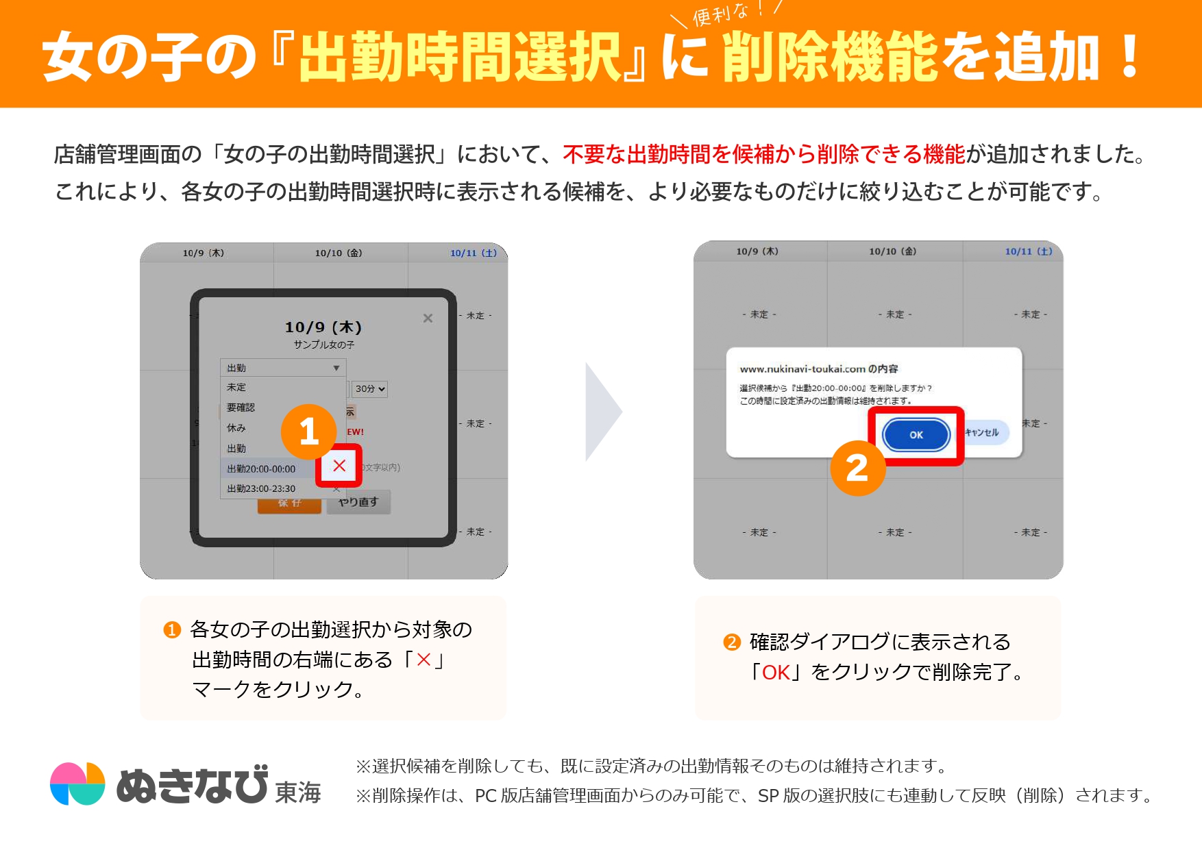 このたびPC版店舗管理画面で、各女の子の「不要な出勤時間候補を削除」できる機能がリリースされました。
