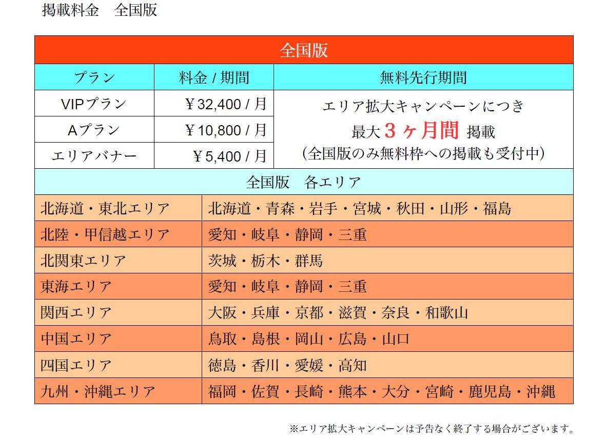 (掲載中止をされた時点で、次回以降ご掲載いただく場合は、通常通りの掲載料金となりますので、ご注意ください。)