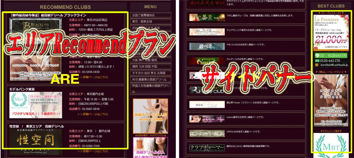 「エリアRecommendプラン(バナーと店舗詳細)」「サイドバナー」を