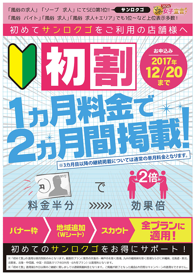 - 「365日マネー女子宣言」へ新規有料掲載の店舗様は、1ヶ月料金で2ヶ月間の掲載が可能な、大変お得なキャンペーンとなっております!
