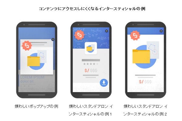 さらに、あらゆるインタースティシャル広告が表示されるページにおいて検索順位を下げるとGoolgeは明言していますので、新たな広告枠やメッセージの表示方法に変更することを推奨いたします。