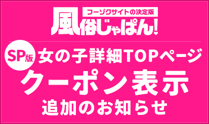 【風俗じゃぱん】SP版女の子詳細TOPページ クーポン表示追加日本最大級の老舗風俗情報サイト「風俗じゃぱん」より、SP版女の子詳細TOPページにクーポン表示の追加のお知らせです! 【SP版女の子詳細TOPページ】クーポン表示の追加 SP版女の子詳細TOPページに「お店が設定しているクーポン」情報が表示されるようになりました。 ※店舗管理画面で「表示」に設定しているクーポン(ポッ...