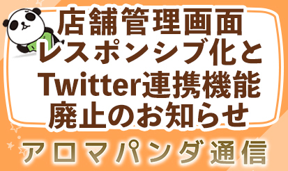 【アロマパンダ通信】「店舗管理画面レスポンシブ化とTwitter連携機能廃...非風俗のメンズエステ集客サイトで大人気の「アロマパンダ通信」より店舗管理画面レスポンシブ化とTwitter連携機能廃止のお知らせです。 概要 この度、「アロマパンダ通信」にて店舗様管理画面のレスポンシブ化とパンダNEWSとTwitter連携機能廃止が 決定いたしましたのでお知らせいたします。 ■店舗様管理画...