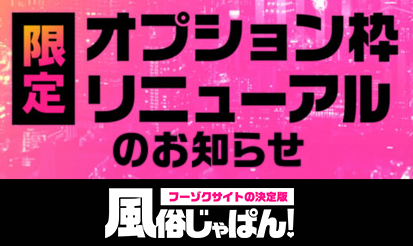 【風俗じゃぱん】限定オプション枠リニューアルのご案内「風俗じゃぱん」より、オプション枠に関するご案内になります! 限定オプション枠リニューアルのご案内 「限定オプション枠」の大幅リニューアルを行われる運びとなりましたので、事前にご案内させていただきます。 リニューアル日時 2023年8月1日(火) 内容 ①限定オプション枠「A...