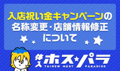 【体入ホスパラ】入店祝い金キャンペーンの名称変更と、名称変更に伴う...体入ホスパラより、3/31(月)入店祝い金キャンペーンの名称変更と、名称変更に伴う店舗情報修正のおねがいです。 入店祝い金キャンペーンの名称変更 2025年3月31日(月)より、入店祝い金キャンペーンが《お仕事応援キャンペーン》に名称変更となります。 上記に伴い、店舗ページ内での【体入ホスパラから入店祝い金(入店支援金)をプレゼントする】と捉えられる表記を&r...