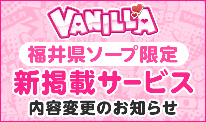 【バニラ】「福井県ソープ限定 新掲載サービス」(バニラ/風俗じゃぱん...風俗求人のお仕事探しといえば、業界での知名度が圧倒的な「バニラ」にお任せ♪ 今年で15周年を迎えたバニラより、 「福井県ソープ限定 新掲載サービス」(バニラ/風俗じゃぱん)廃止のお知らせになります! 概要 ■実施契約月~対象業種まで 実施契約月:2023年10月契約~(=23年9月契約で廃止) 対象エリア:福井県 対象業種:ソープ ...