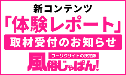 【風俗じゃぱん】新コンテンツ『体験レポート』取材受付のお知らせ「風俗じゃぱん」より、新コンテンツ『体験レポート』に関するお知らせになります♪ 新コンテンツ『体験レポート』取材受付のお知らせ 体験レポートの詳細はこちらを参考にしてください。 体験レポートのご案内 リリースに先立ち、体験レポートの取材申し込みの受付が開始となります! 対象店舗の条件&...
