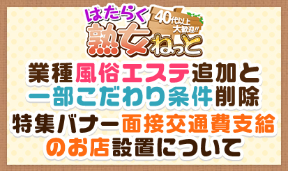 【はたらく熟女ねっと】\"業種《風俗エステ》追加と一部こだわり条件削...「はたらく熟女ねっと」より、"業種《風俗エステ》追加と一部こだわり条件削除"&"特集バナー《面接交通費支給のお店》設置"についてのお知らせです。 12月1日より「業種の追加」と「こだわり条件の一部削除」されました。 ▼業種《風俗エステ》追加【有料掲載店・無料掲載店】 業種に「風俗エステ」を追加されました。 風俗エステ店で働きたい女性に検索しやすくなり...