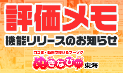 【ぬきなび東海】『評価メモ』機能リリースのお知らせ愛知・岐阜・三重・静岡の風俗を探すなら!コンテンツが充実しており、行きたいお店がすぐ見つかる、ぬきなび東海より、『評価メモ』機能リリースのお知らせになります。 新機能について この度、女の子マイページに『評価メモ』機能を追加となりましたのでお知らせいたします! ■リリース日 2023年6月15日(木) ※リリース済み ■概要 女の子マイページにおいて、特...