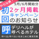 【デリヘルが呼べるホテル】旅行が増えるであろうこの時期に「初回2ヶ月...認知度No.1!!「ホテル名×デリへル」のキーワードで堂々の1位! ホテル利用客のアドバイス・雑談で盛り上がっているデリヘルが呼べるホテルより、「初回2ヵ月キャンペーン」のお知らせです! キャンペーン概要 1ヶ月分の掲載料金で初回2ヶ月間の掲載が可能となります! 現在ご掲載中の店舗様は新規エリア追加につきましても、キャンペーンの対象となります! ...