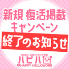 【ハッピーハローワーク】「新規・復活掲載キャンペーン」終了のお知らせ。都内はもちろん、地方でも「エリア 風俗 求人」「エリア 風俗 高収入」等のワードでSEO上位を維持している 「ハッピーハローワーク」より「新規・復活掲載キャンペーン」終了のお知らせです。 概要 この度、「ハッピーハローワーク」にて実施しておりました下記「新規・復活掲載キャンペーン」でございますが、 4月30日を持ちまして一旦終了させていた...