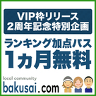 【爆サイ.com】VIP枠リリース2周年記念特別企画開催!昔からお馴染みの日本最大級のローカルクチコミサイトの爆サイ.comより、VIP枠 2周年記念感謝企画のお知らせです! VIP枠リリース2周年記念特別企画について 風俗VIP枠、メンエスVIP枠がリリース2周年となりましたので、VIP枠を掲載されている店舗様へ2周年記念特別企画が開催となりました♪ 概要 ◇企画内容:ランキング加点パス(ブロンズ)1ヵ月無料 ...
