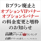【高級デリヘル求人パーフェクトガイド】Bプラン廃止と「オプションVIP...全国の高級デリヘルを求めるユーザーに効果抜群のランキングサイト!「高級デリヘル求人パーフェクトガイド」より Bプラン廃止と「オプションVIPバナー」&「オプションSバナー」の料金変更と増枠のお知らせです! Bプラン廃止に関しまして ■現在Bプランで掲載中の店舗様について 5月継続して頂いた場合は、自動的にAプランに移行させて頂きます。 <自動的にAプラン...