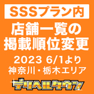 【デリヘルタウン】SSSプラン内での店舗一覧の掲載順位について※神奈川...デリヘルの集客サイトと言えば、デリヘルタウン!そんなデリヘルタウンの店舗一覧の掲載順位が一部エリアにて変更となります。 店舗一覧掲載順位の変更について 2023年6月1日以降、神奈川・栃木エリアにおきまして、SSSプラン内での店舗一覧の掲載順位につきまして、以下のとおり仕様変更となります。 【現在の掲載順位】 1. 「SSSプラン」 → 「SS...