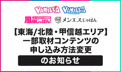 【バニラ・メンズバニラ・風俗じゃぱん・メンエスじゃぱん】【東海/北陸...バニラ・メンズバニラ・風俗じゃぱん・メンエスじゃぱんより、【東海/北陸・甲信越エリア】一部取材コンテンツの申し込み方法変更のお知らせです。 概要 この度≪東海/北陸・甲信越≫エリアの、一部取材コンテンツお申し込み方法が変更となりました。 ■変更点 【変更前】申し込み方法:メール ⇩ 【変更後】申し込み方法:グーグルフォーム &nbs...