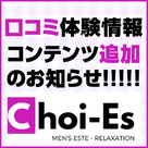 「理想のセラピストに会える!」、「行きつけのお店が見つかる!」メンズエステファン必見の注目の、投票形式のメンズエステ情報共有サイトといえば、Choi-Es(チョイエス)より、口コミ体験情報コンテンツ追加のお知らせです!!   概要 Choi-Es(チョイエス)大阪・名古屋版での新たなコンテンツとしまして、セラピスト個人ページに口コミ体験情報の書き込みができるよう追加いたしました。つ...