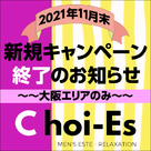 メンズエステ店とセラピストが一目でわかるメンズエステ専門投票形式の共有サイトといえば、Choi-Es(チョイエス)より、2021年11月末にて新規キャンペーン終了のお知らせです!   概要 現在実施中の、新規店舗様限定の新規キャンペーン(初回3ヶ月掲載)ですが、大阪エリアに関して、2021年11月末にて新規キャンペーン終了となりますのでお知らせいたします。2021年12月1日掲載ス...
