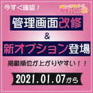 【キャバイト】2021年1月7日より掲載順位の仕様が変わります!キャバイトから体験入店をしたら最大7,000円のお祝い金をプレゼント中の「キャバイト」より、「管理画面改修」&「新オプション販売」のお知らせです! 「管理画面改修」について これまでは、新着情報の更新・店長ブログの投稿で掲載順位が同一プラン内において最上位となる仕様でしたが、同一内容の連続投稿が多くを占める状態となり、お店を探す女の子に向けて有益情報となっていないケースが多く起...