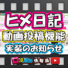 【口コミ風俗情報局】 『ヒメ日記動画投稿機能』実装のお知らせ♪全国の風俗、デリヘルの口コミ掲載数NO.1の「口コミ風俗情報局」より、『ヒメ日記動画投稿機能』実装のお知らせです!! 概要 8月26日(火)より、ヒメ日記において、動画投稿機能が実装となりました!! これまで「ヒメ日記」では、画像のみの投稿でしたが、機能追加により、動画付きのヒメ日記が投稿可能になりました!! TOPページより、[女の子 ⇒ヒメ日記 ⇒動...