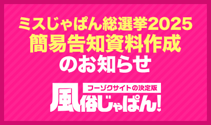 【風俗じゃぱん】「ミスじゃぱん総選挙2025」簡易告知資料作成のお知らせ風俗じゃぱんより、「ミスじゃぱん総選挙2025」簡易告知資料作成のお知らせです。 概要 5/23にご案内させて頂きました風俗じゃぱん「ミスじゃぱん総選挙2025」に関しまして、運営元より告知資料の重要項目のみをピックアップした「簡易告知資料」が作成されました。 こちらの資料につきましては、必要に応じて下記よりご活用ください。 ※風俗じゃぱん「ミスじゃぱん総選挙2025」の詳...